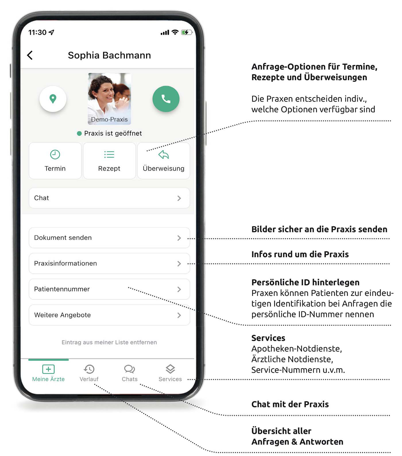 Die App zum Doc unterstützt hierbei in der täglichen Kommunikation zwischen PatientInnen und Arztpraxen.